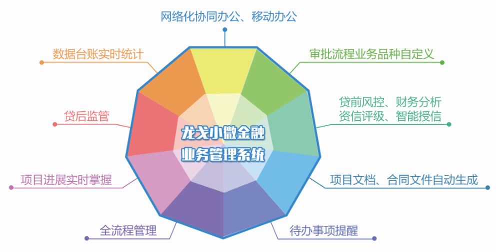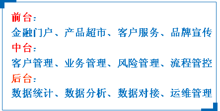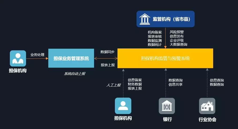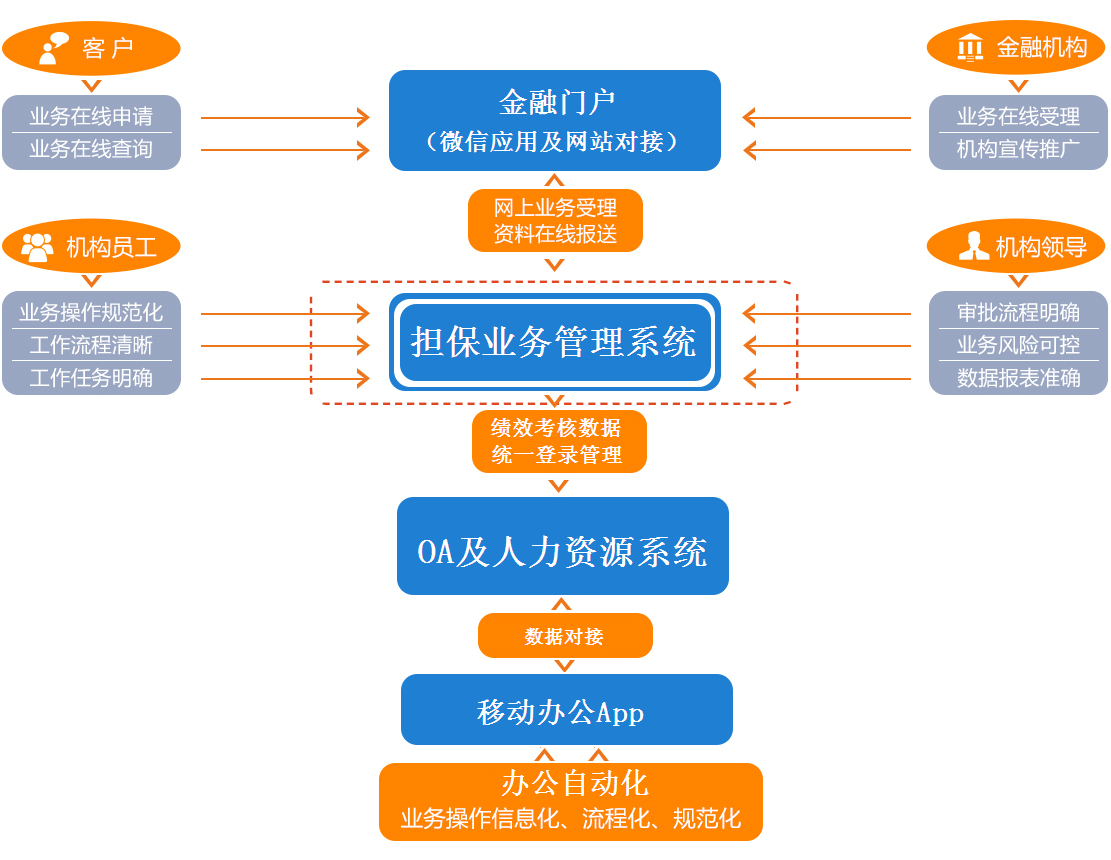 形成以业务管理为核心,打通线上金融门户、后台运维管理及数据对接;形成担保机构整体的信息化、互联化解决方案。