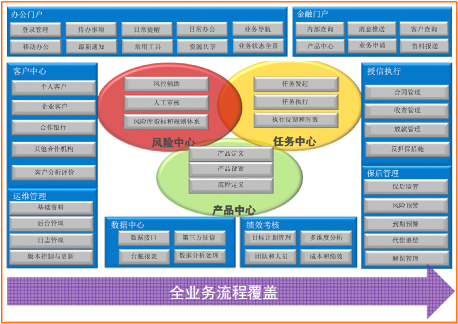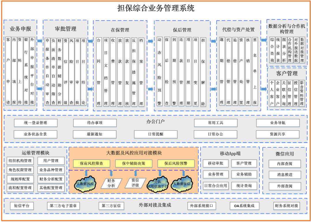 系统由11大模块构成,分别为业务申报、审批管理、在保管理、保后管理、代偿与资产处理管理、办公门户、大数据风控管理、客户管理、数据管理、运维管理、外部对接,各模块之间在保持独立模块化建设的同时又可以进行无缝对接,真正实现了模块之间的完美融合。
