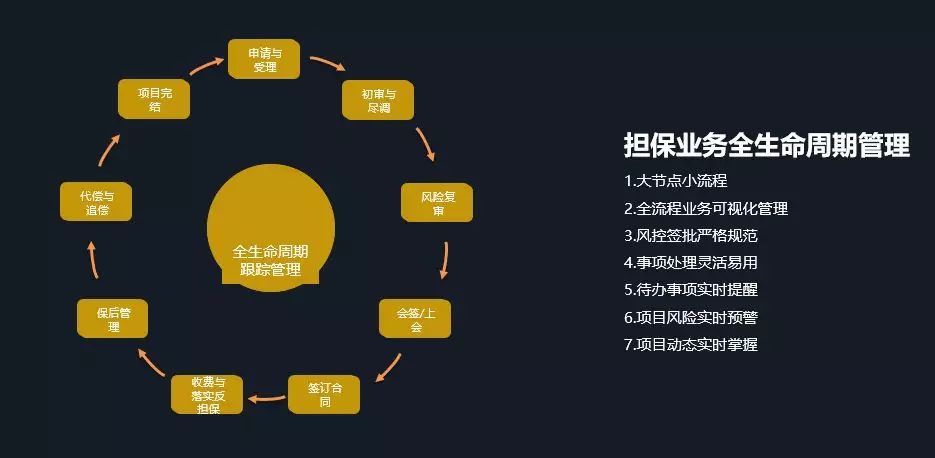 系统支持担保业务从“申请与受理”到“项目完结”全流程管理。利用全流程业务可视化管理、风控签批严格规范、事项处理灵活易用、待办事项实时提醒、项目风险实时预警、项目动态实时掌握等系统特点,可以使系统在处理业务上简单、安全、易用。