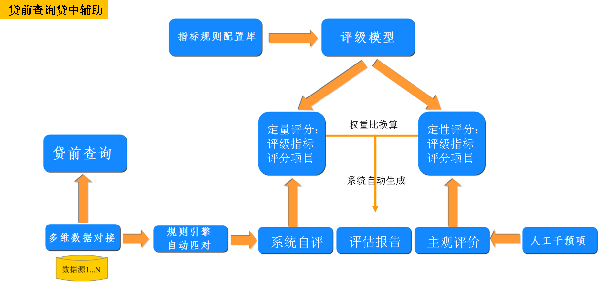 保中辅助:结合资信评估系统,风险指标配置库,完成对借款人的大数据画像和客观信用评分,用于保中风控辅助。