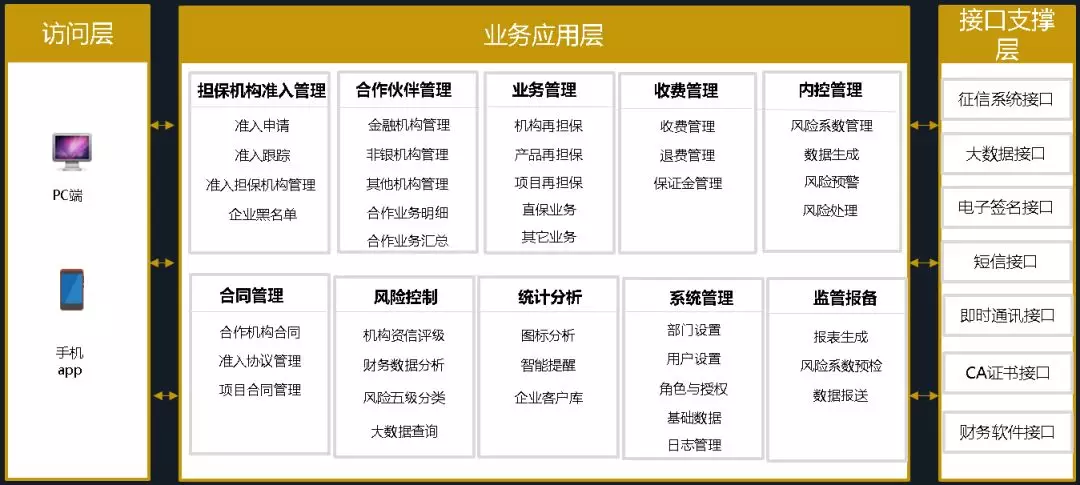 业务应用层:包含业务申报、审批管理、在保管理、保后管理、代偿与资产处理管理、办公门户、客户管理、合作机构管理、数据报表管理等各个应用功能模块。